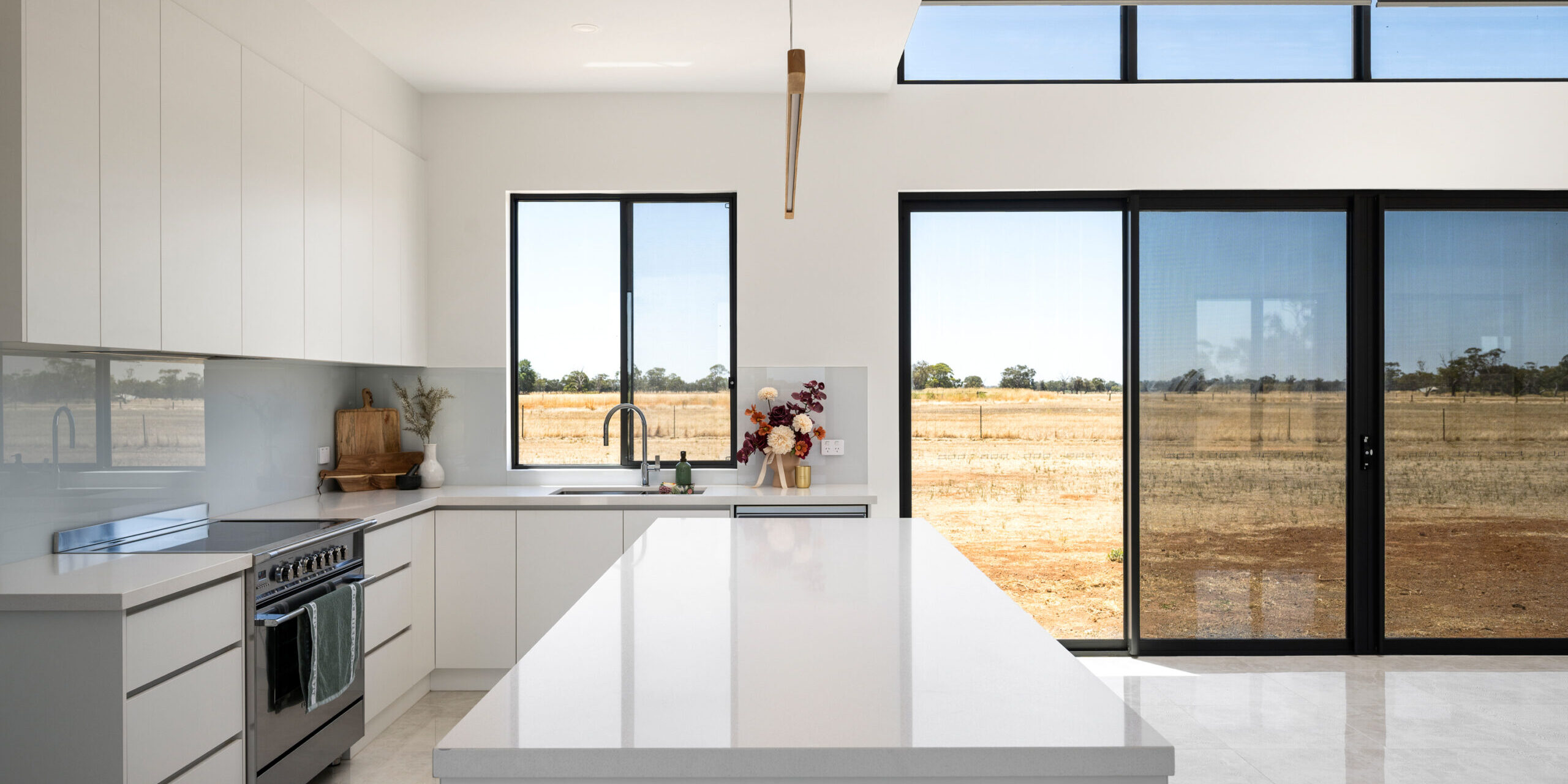 An H-shaped acreage custom home designed to grow with your family, anchored by open-plan living and a light grey stacked stone fireplace framed in dark modern brick.