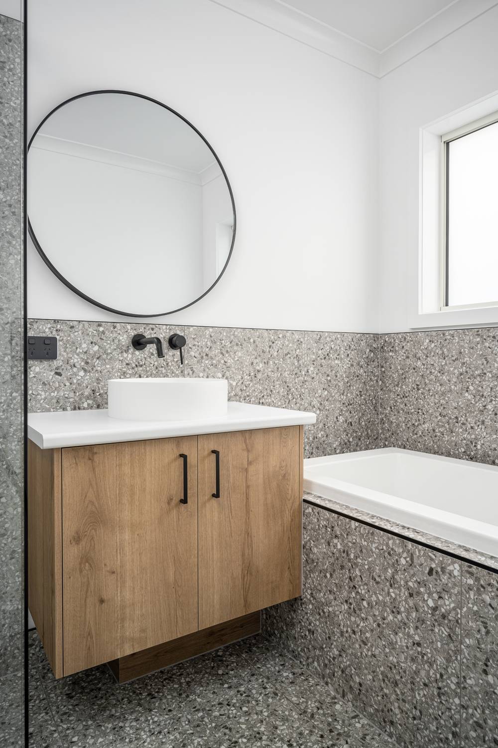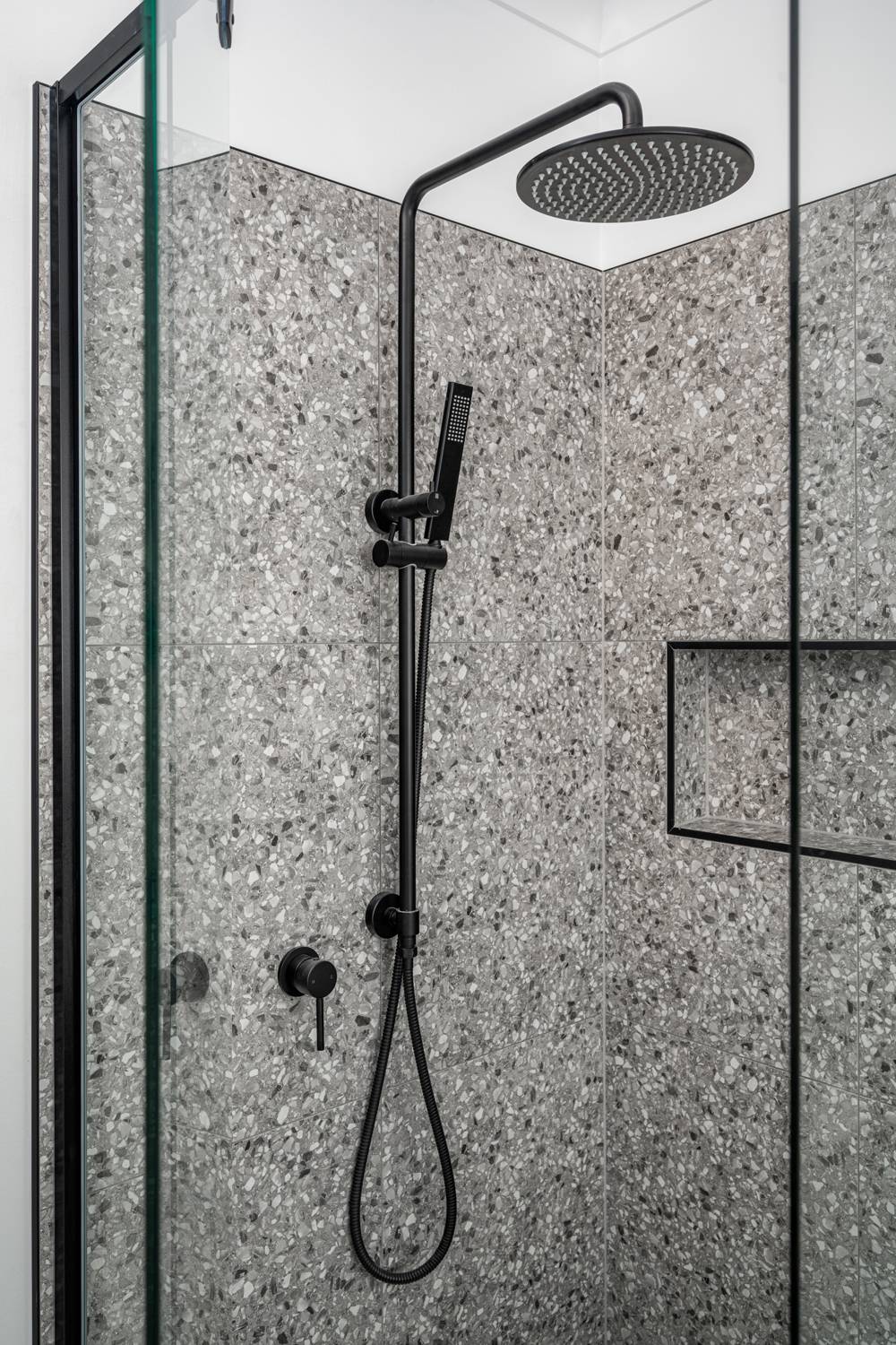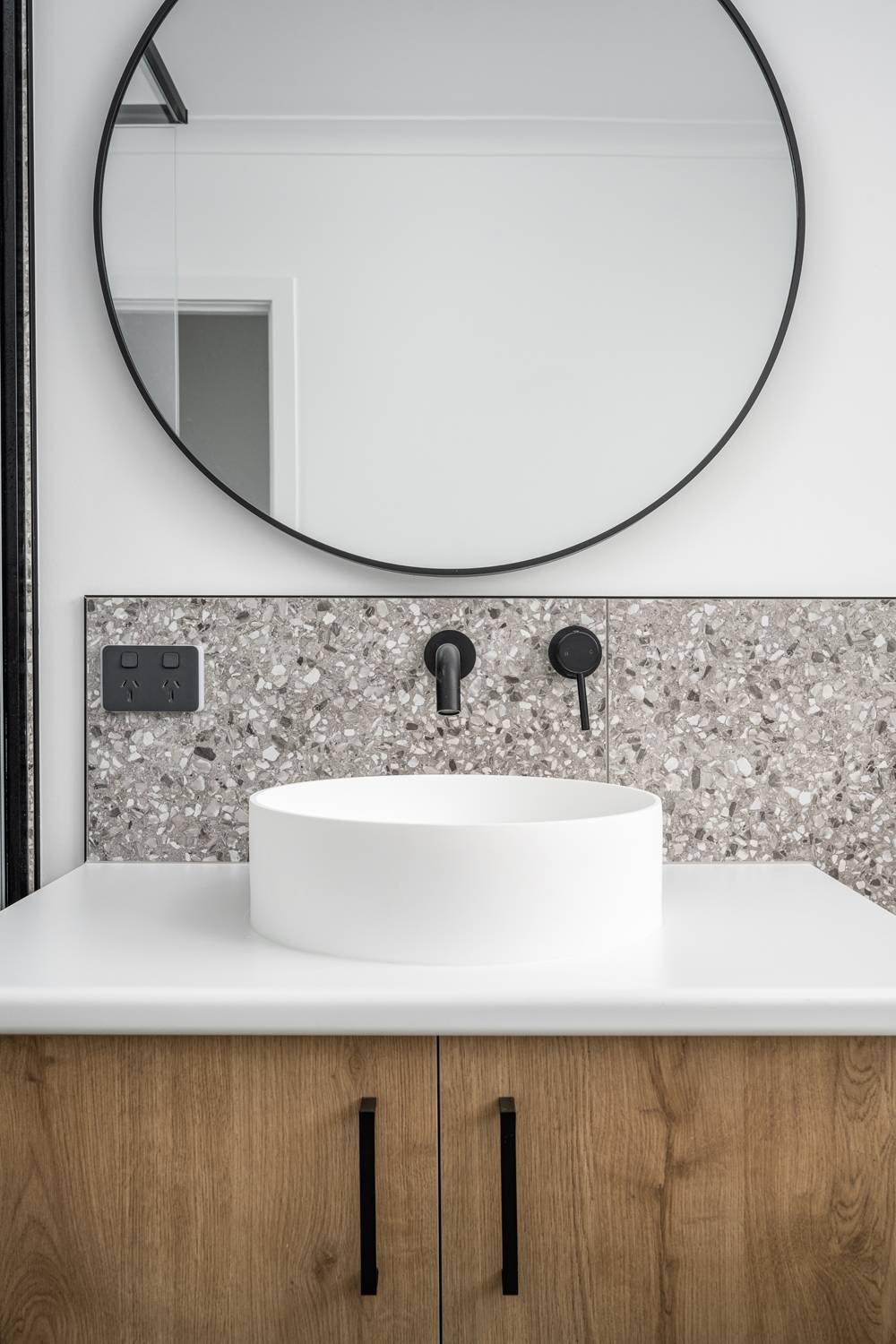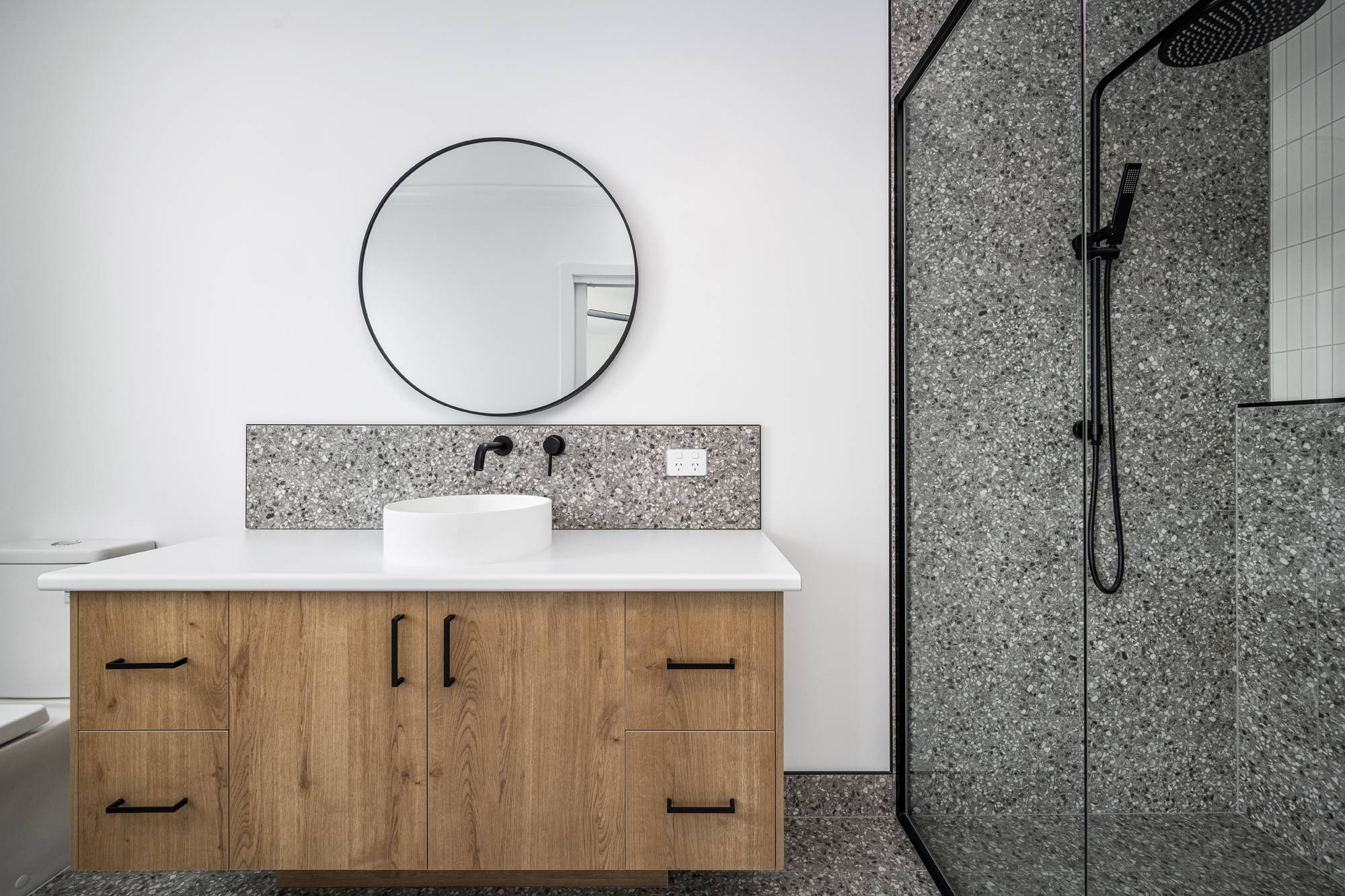 With a clean crisp white kitchen contrasting against the black and timber elements the client went bolder in the bathrooms with a stunning terrazzo like tile truly making a statement.
