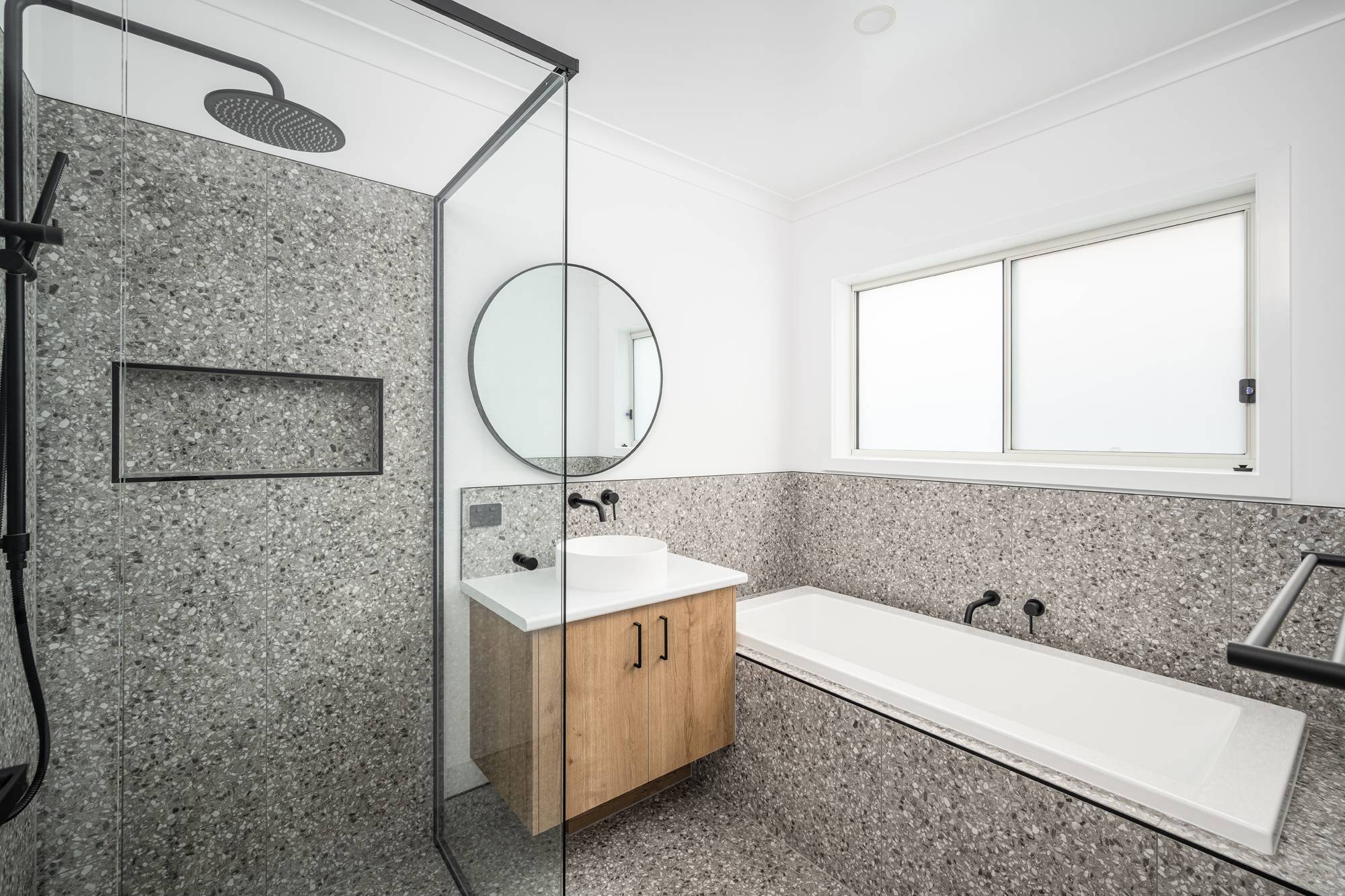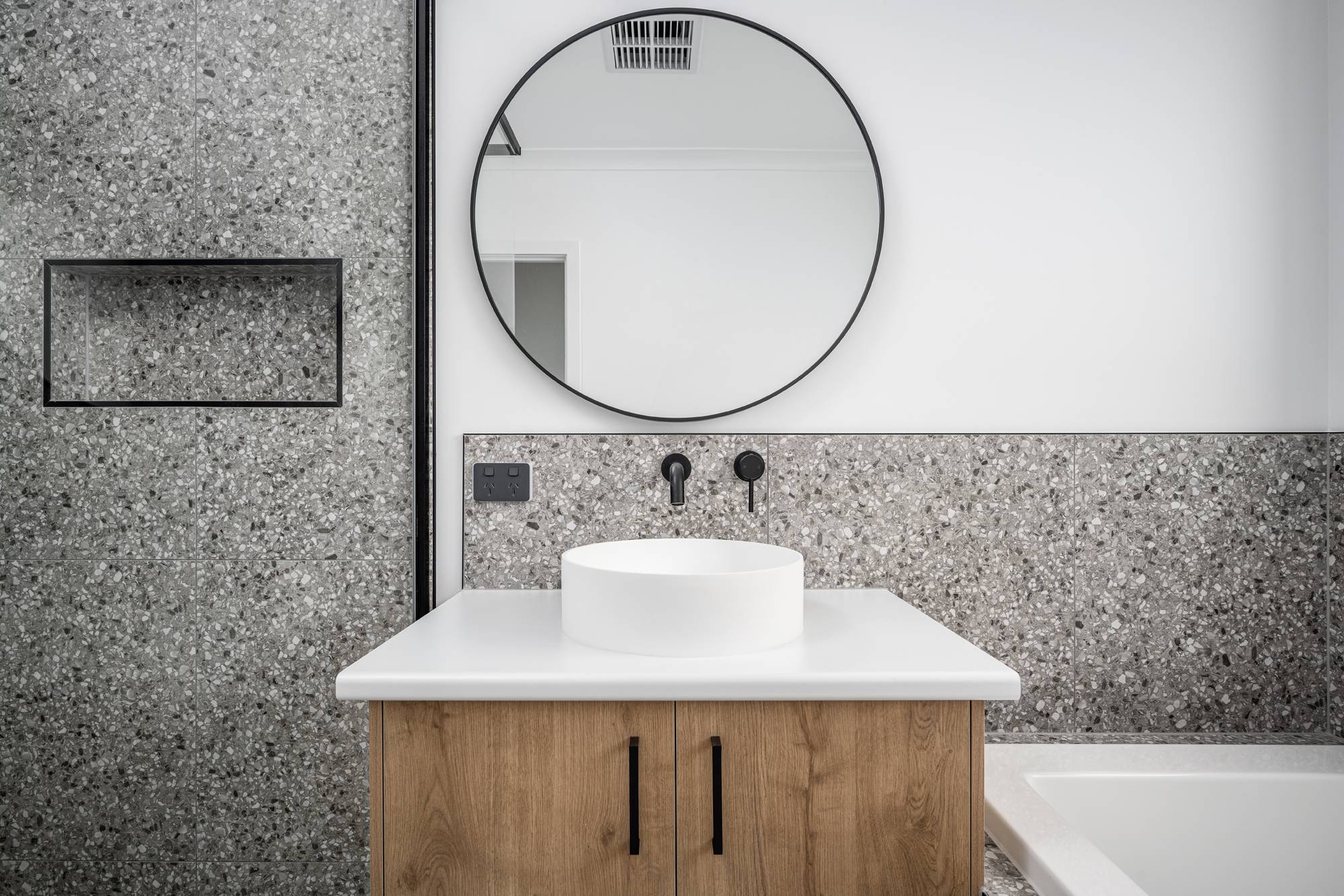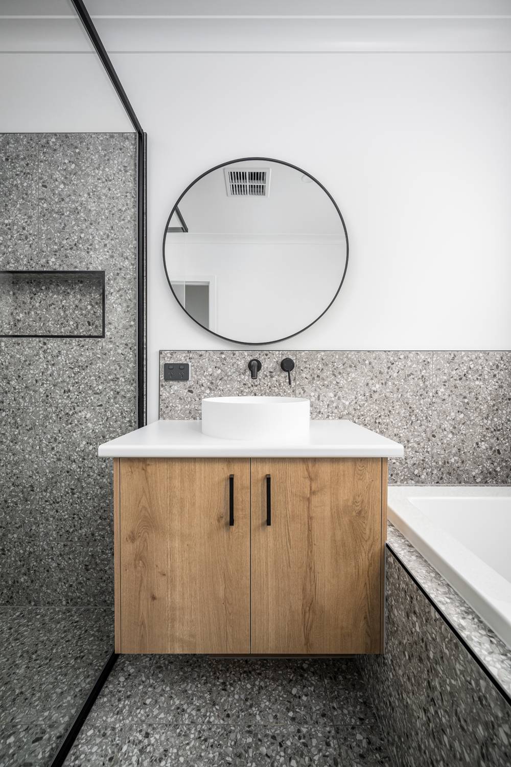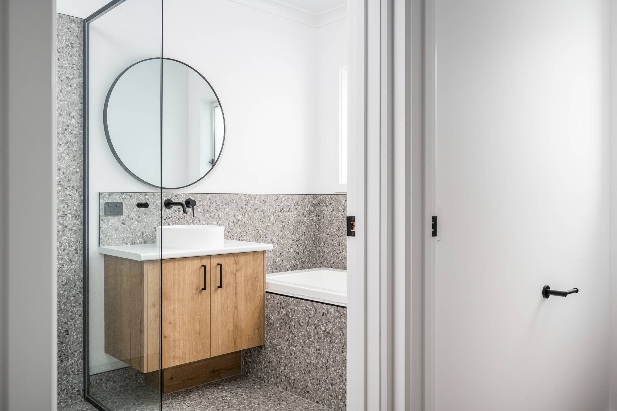 With a clean crisp white kitchen contrasting against the black and timber elements the client went bolder in the bathrooms with a stunning terrazzo like tile truly making a statement.
