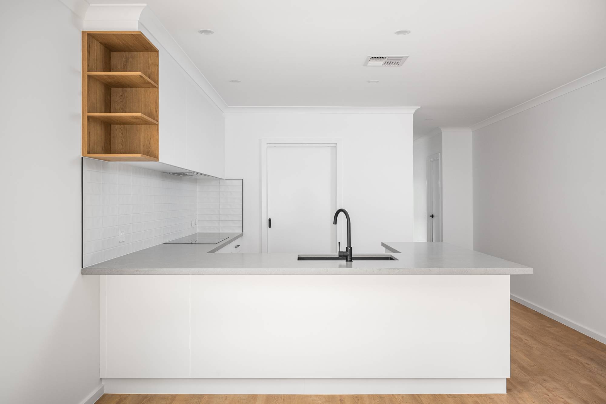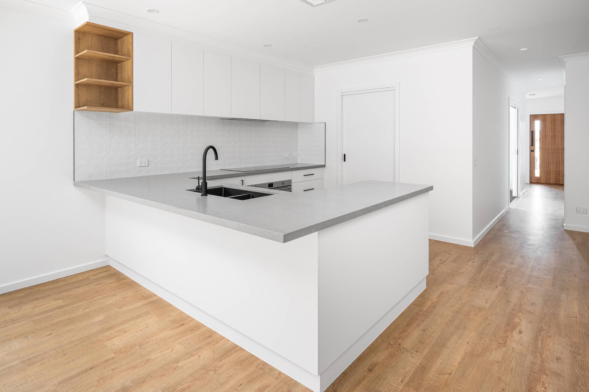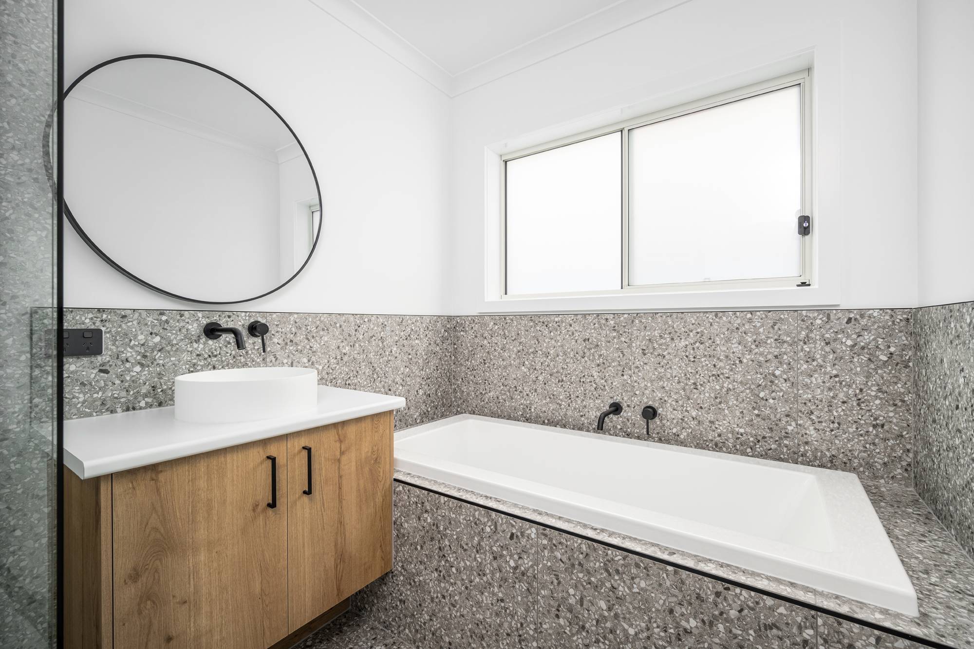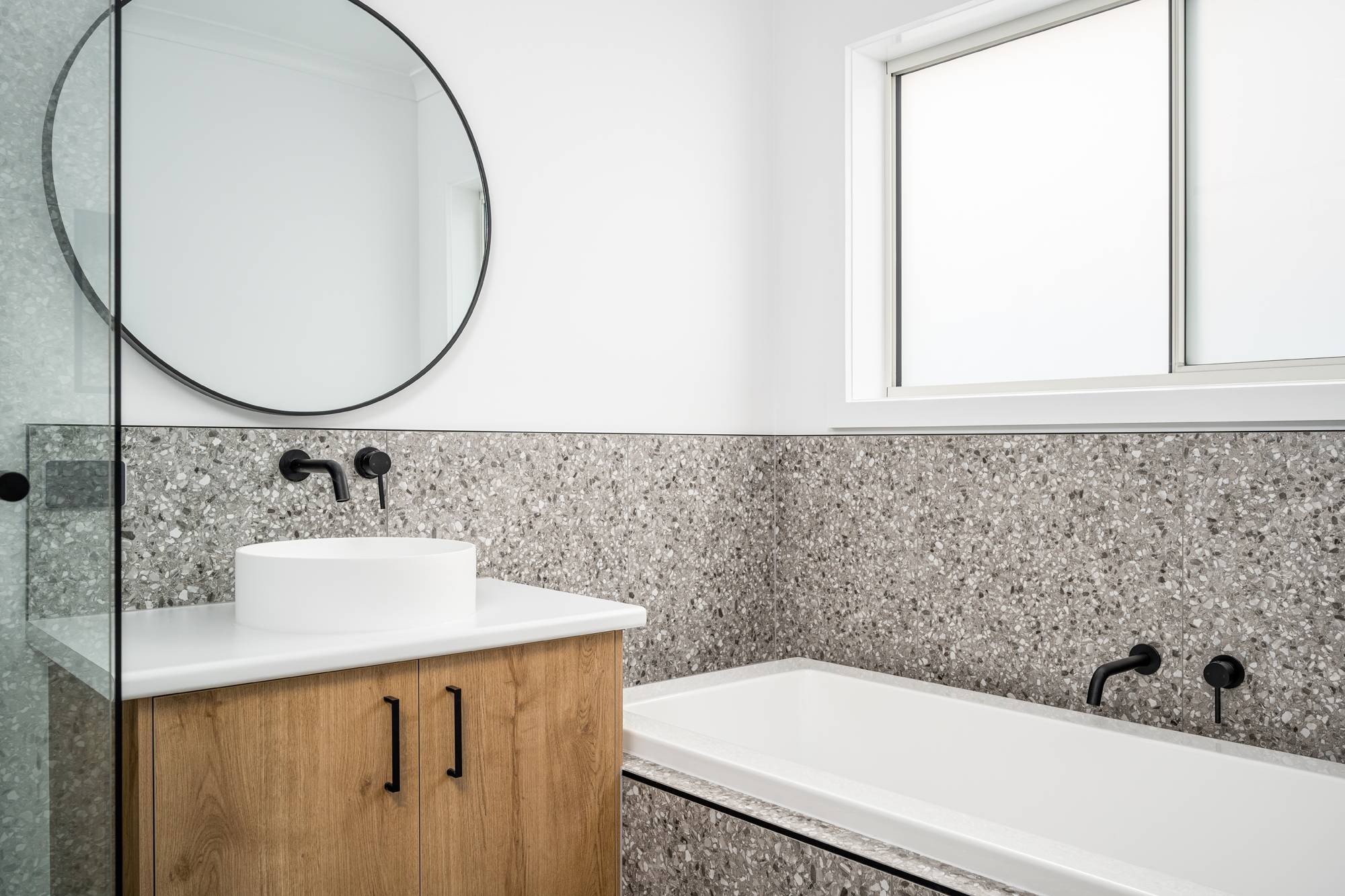 With a clean crisp white kitchen contrasting against the black and timber elements the client went bolder in the bathrooms with a stunning terrazzo like tile truly making a statement.